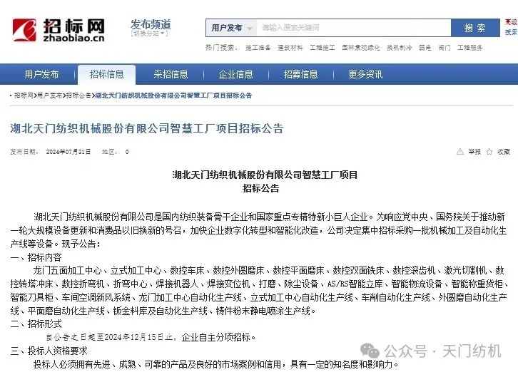 近日,天門紡機(jī)對(duì)外發(fā)布設(shè)備招標(biāo)公告,正式啟動(dòng)“智慧工廠”項(xiàng)目新一輪設(shè)備采購(gòu)計(jì)劃。